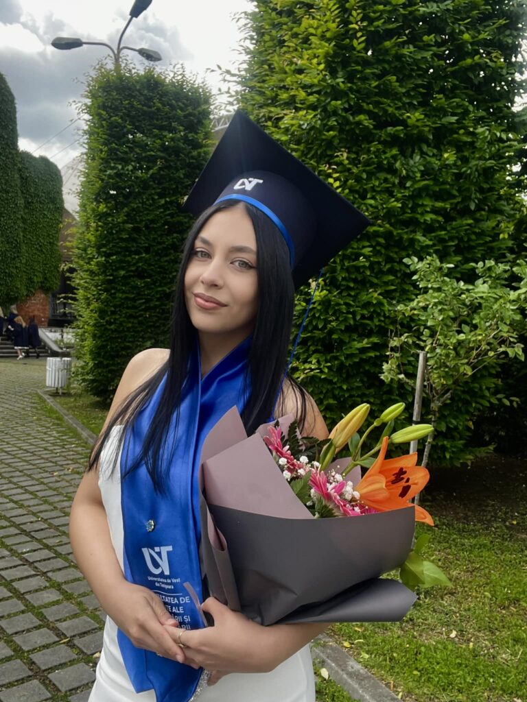 Facultatea m-a ajutat să mă dezvolt foarte mult. Provin dintr-un oraș mic, iar atunci când am venit la Timișoara am realizat că există și o „altfel de lume”. Am fost foarte fericită că am ales o facultate practică, unde creativitatea studenților nu avea bariere, iar profesorii ne-au învățat cum să ne punem în evidență aptitudinile. Unora le plăcea mai mult să scrie, altora să vorbească, cum este și cazul meu. În timpul facultății am avut proiecte care au implicat interviuri, astfel că am învățat cum să abordez o persoană și cum să mă documentez înainte de a trata un subiect sau de a avea o întâlnire, lucruri de care țin cont și în prezent.